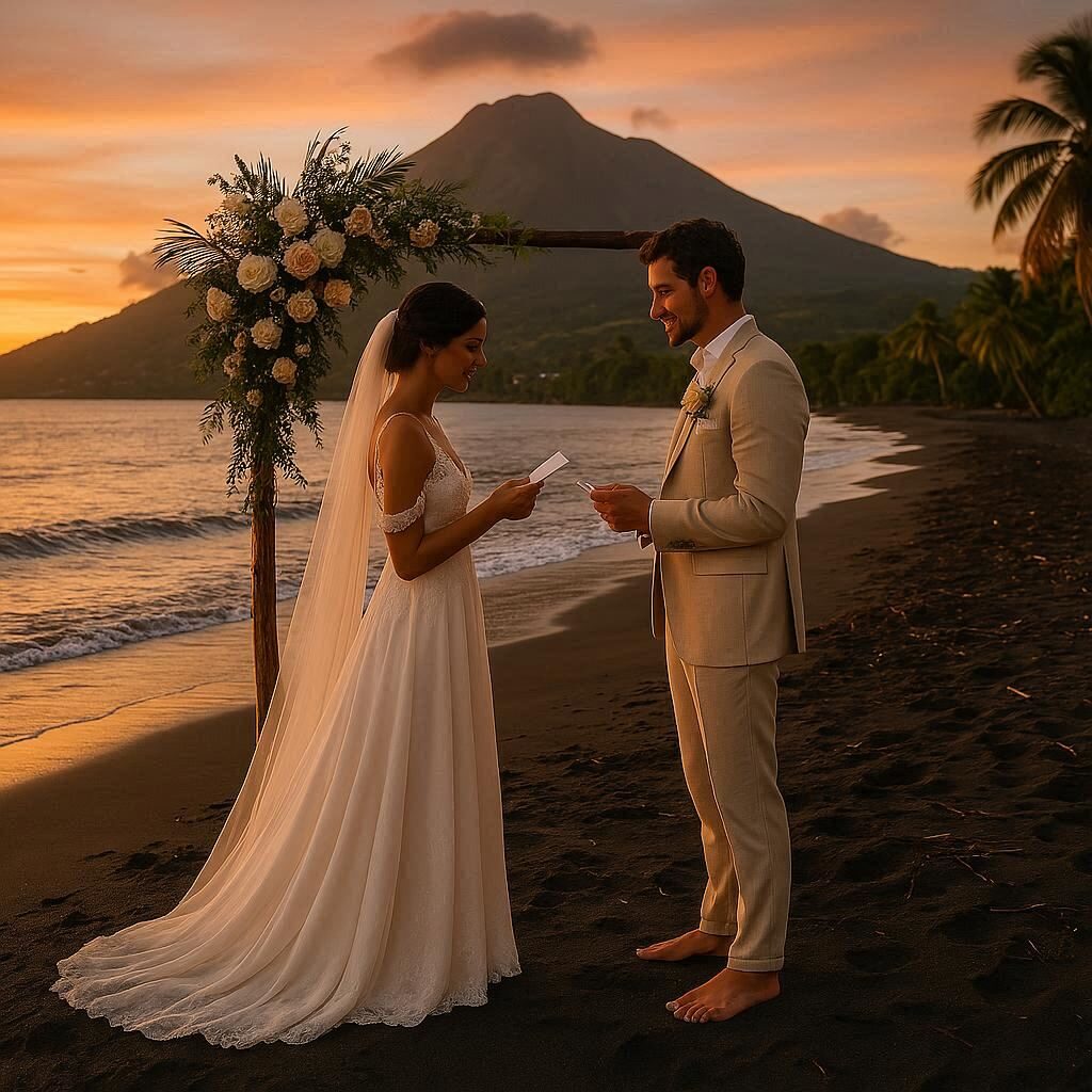 Imaginez échanger vos vœux pieds nus sur une plage de sable noir volcanique, avec pour témoin le majestueux Mont Pelée en arrière-plan. Un mariage-voyage en Martinique transforme votre union en une aventure caribéenne inoubliable, où chaque moment devient un souvenir précieux gravé dans un décor paradisiaque.